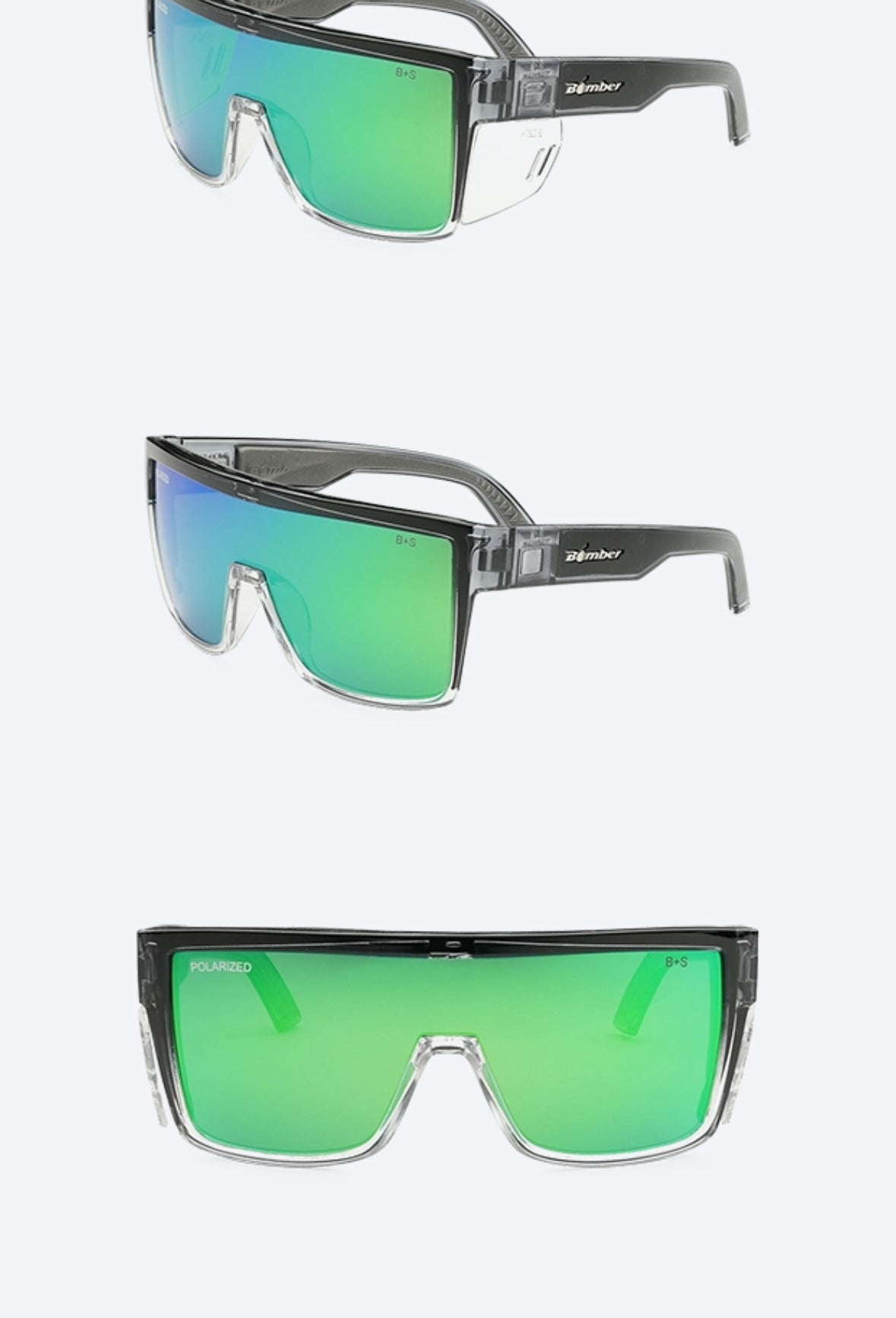 Protect your vision both on and off the job with the Buzz-Bombs, a pair of angular green mirror polarized sunglasses fully equipped with removable side shields. When your job requires ANSI Z87+ safety rated glasses or when extra side protection is necessary, simply attach the side shields into place. Or when you don’t need the extra protection from sideways wind and debris, you may prefer to go without the added weight, and goggle-like effect of the side shields.